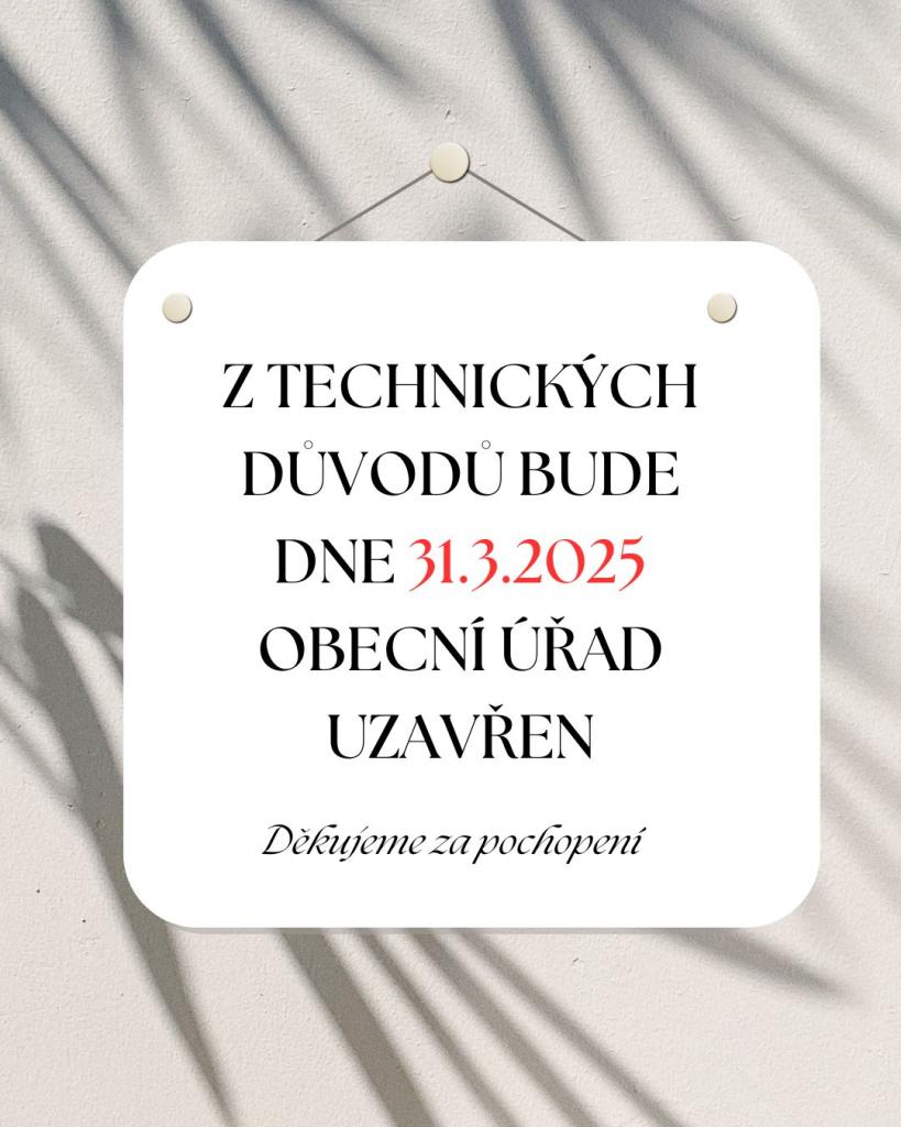 Dne 31.3.2025 budou z technických důvodu zrušeny úřední hodiny. Děkujeme za pochopení.