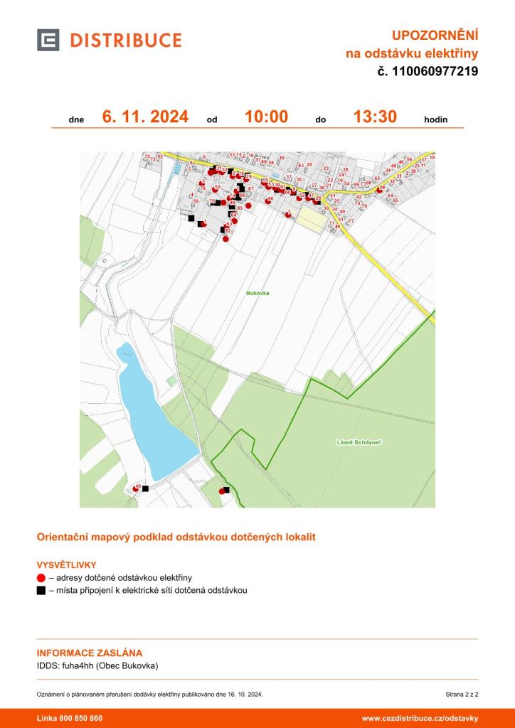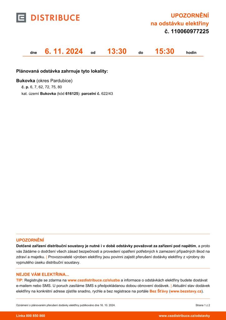 Plánovaná odstávka elektřiny dne 6.11.2024!!! Pozorně si přečtěte jaká lokalita bude v daném čase odstavena.